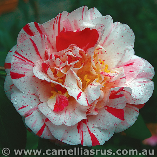 FLOWER COLOUR: RED HEAVILY VARIEGATED WITH WHITE STRIPES AND SPOTS OF OTHER SHADES OF RED